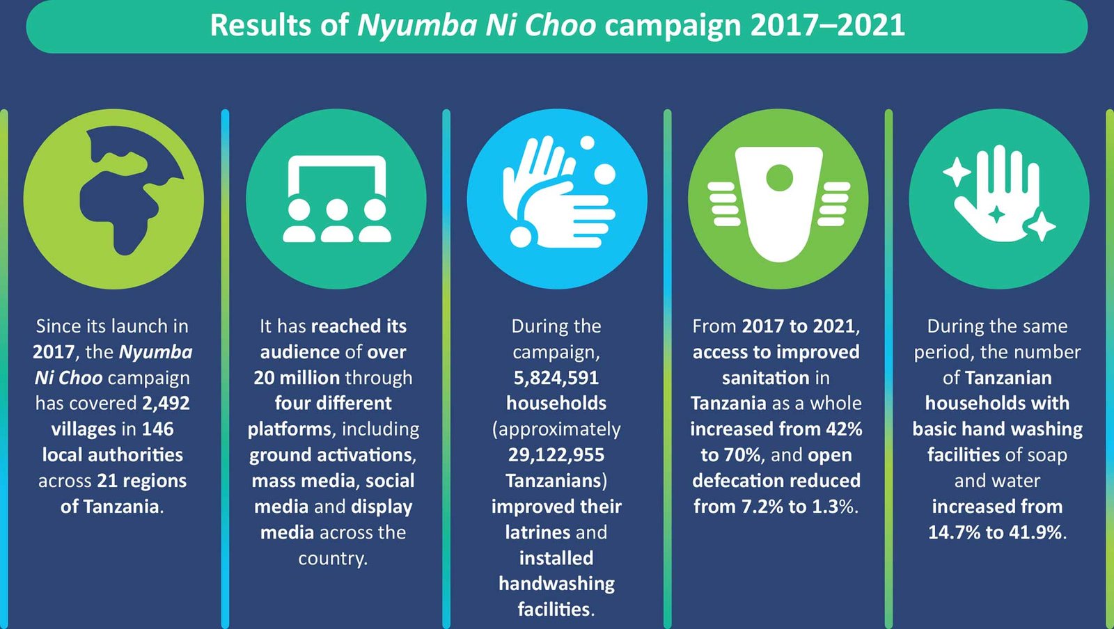 During the campaign, 5,824,591 households (approximately 29,122,955 Tanzanians) improved their latrines and installed handwashing facilities. From 2017 to 2021, access to improved sanitation in Tanzania as a whole increased from 42% to 70%, and open defecation reduced from 7.2% to 1.3%. During the same period, the number of Tanzanian households with basic hand washing facilities of soap and water increased from 14.7% to 41.9%.